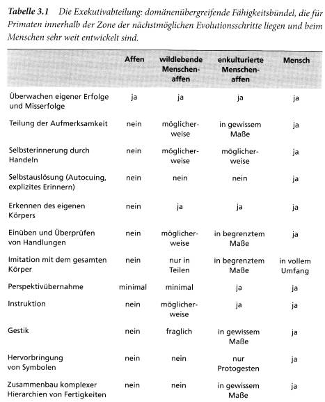 Hieraus erwächst die Funktion des Bewusstseins, den eigenen Körper zu erkennen und von der Umwelt unterscheiden zu lernen. Ein solches Selbstbewusstsein ist erstmalig bei Primaten zu erkennen und bildet die Grundlage für die höheren geistigen Funktionen der Hominiden. Diese Funktionen haben sich in der Evolution der Hominiden schrittweise entwickelt und entwickeln sich heute in der gleichen Reihenfolge bei der ontogenetischen Entwicklung der Kinder. Dabei tragen immer gerade diejenigen Funktionen und Fähigkeiten am stärksten zur Weiterentwicklung der Art bei, die jeweils bei der Mehrzahl der Individuen noch nicht vorhanden sind, aber mit Anstrengung erlernt werden können. Durch Vergleich der Fähigkeiten heutiger Affen, wildlebender Menschenaffen und enkulturierter Menschenaffen mit denen des Menschen gewinnt man eine Vorstellung, in welchen Schritten sich die höheren geistigen Fähigkeiten des Menschen entwickeln konnten. Der Autor stellte die Entwicklung dieser Fähigkeiten in folgender Tabelle zusammen:[if gte vml 1]><v:shapetype id="_x0000_t75" coordsize="21600,21600" o:spt="75" o:preferrelative="t" path="m@4@5l@4@11@9@11@9@5xe" filled="f" stroked="f"> <v:stroke joinstyle="miter"/> <v:formulas> <v:f eqn="if lineDrawn pixelLineWidth 0"/> <v:f eqn="sum @0 1 0"/> <v:f eqn="sum 0 0 @1"/> <v:f eqn="prod @2 1 2"/> <v:f eqn="prod @3 21600 pixelWidth"/> <v:f eqn="prod @3 21600 pixelHeight"/> <v:f eqn="sum @0 0 1"/> <v:f eqn="prod @6 1 2"/> <v:f eqn="prod @7 21600 pixelWidth"/> <v:f eqn="sum @"/> <v:f eqn="prod @7 21600 pixelHeight"/> <v:f eqn="sum @"/> </v:formulas> <v:path o:extrusionok="f" gradientshapeok="t" o:connecttype="rect"/> <o:lock v:ext="edit" aspectratio="t"/> </v:shapetype><v:shape id="_x0000_i1025" type="#_x0000_t75" style='width:350.25pt; height:432.75pt'> <v:imagedata src="file:///H:/DOKUME~1/BHOMEB~1.000/LOKALE~1/Temp/msoclip1/01/clip_image001.png" o:title="msotw9_temp0"/> </v:shape><![endif]